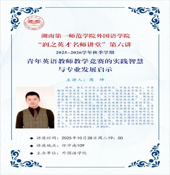 10月28日晚,88看球 “润之英才名师讲堂”第六讲在怀中南109教室温情启幕。本次讲座特邀湖南省雅礼中学骨干教师周坤担任主讲嘉宾,由副院长陈钰教授主持,公共外语教研二室主任曾碧锋副教授、英语系王小玲老师、翻译系唐江英老师、公共外语教研二室唐新萍老师联袂出席,2023级、2024级英语“润之英才”班全体同学共同参与,共赴一场关于英语教学艺术与专业发展的思想盛宴。