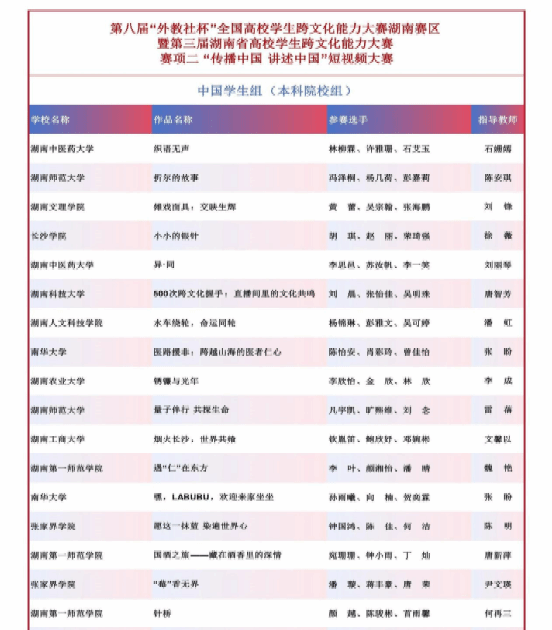 在赛项二(“讲述中国 传播中国”短视频大赛)中,我校学子同样斩获佳绩,三件作品均获一等奖并全部晋级全国决赛,展现出卓越的创意表达与文化传播能力。具体获奖名单如下:
