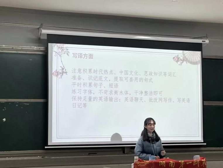 马赫泽同学从英语学习的重要性谈起,继而介绍了四级考试的时间安排、报名注意事项及考场规则。在备考方法上,他分听力、阅读、写作与翻译三大模块,细致分享了自己的学习心得与实用技巧,并鼓励同学们以积极、从容的心态迎接即将到来的考试。