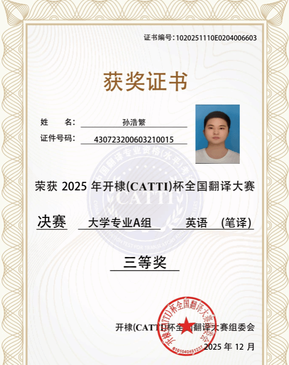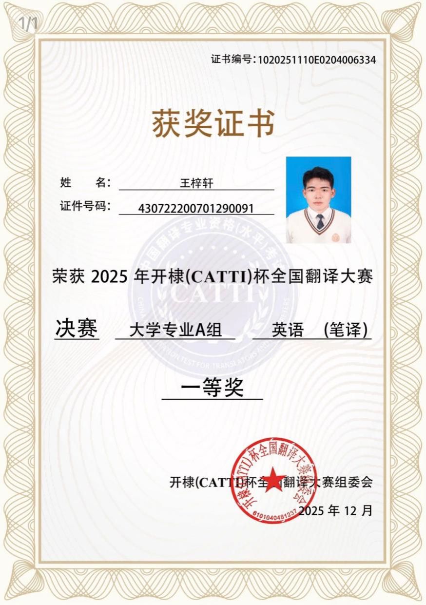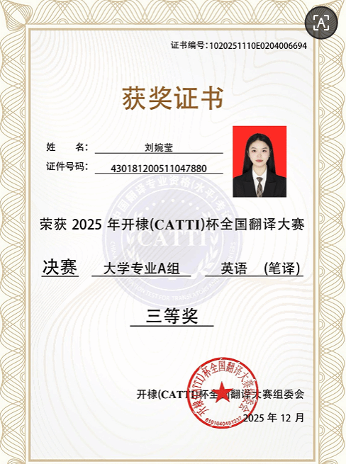 2025年11月,由全国翻译专业学位研究生教育指导委员会和中国外文局翻译院联合主办的2025年“CATTI杯”全国翻译大赛全国总决赛圆满落幕。我校学生在本次比赛中表现优异,取得了一个一等奖,两个二等奖,七个三等奖的好成绩。王梓轩同学获得笔译决赛一等奖,何雅芳、王兰萍获得笔译决赛二等奖,黄月、付嘉超、汤嘉霖、孙浩繁、刘婉莹、杨逸凡、王媚获得笔译决赛三等奖。获奖同学的指导老师是李满红、张丽红、曾昭艳、向红、李爱华等老师。