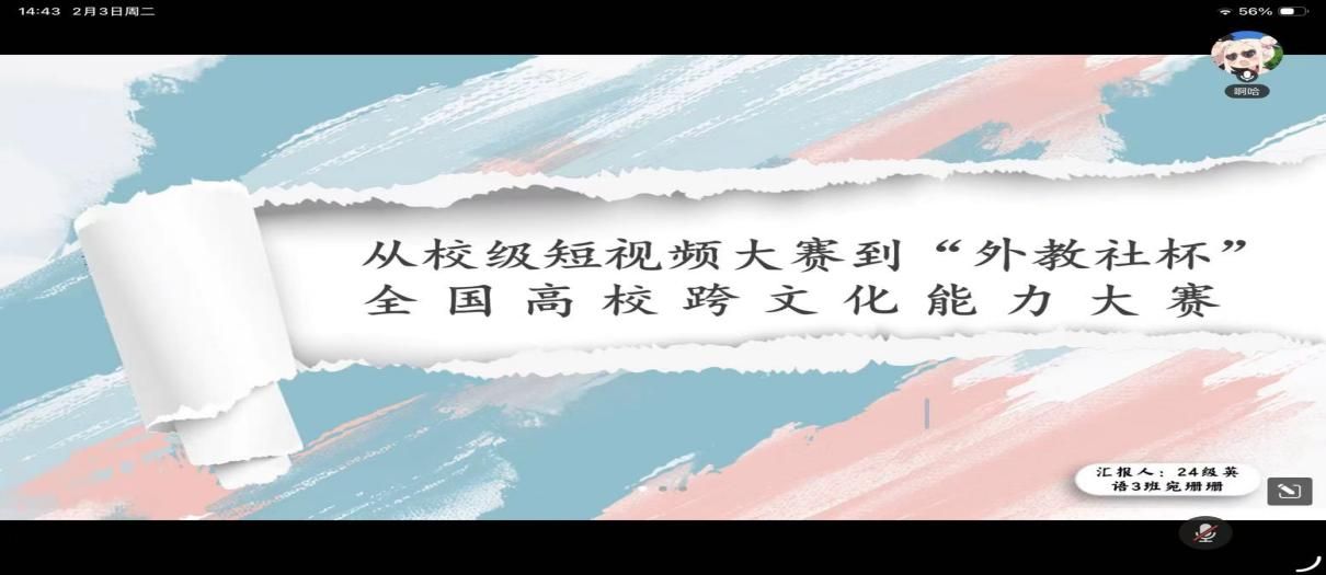 为提升学生新媒体创作能力与跨文化传播素养,助力学子高质量备战省级、国家级大学生短视频竞赛,2026年2月3日下午,88看球 通过腾讯会议线上举办短视频竞赛备赛经验分享会。会议由向红博士主持,24级英语3班宛姗姗同学担任主讲嘉宾,学院众多意向参赛学子齐聚云端,共学创作技巧、交流备赛心得。