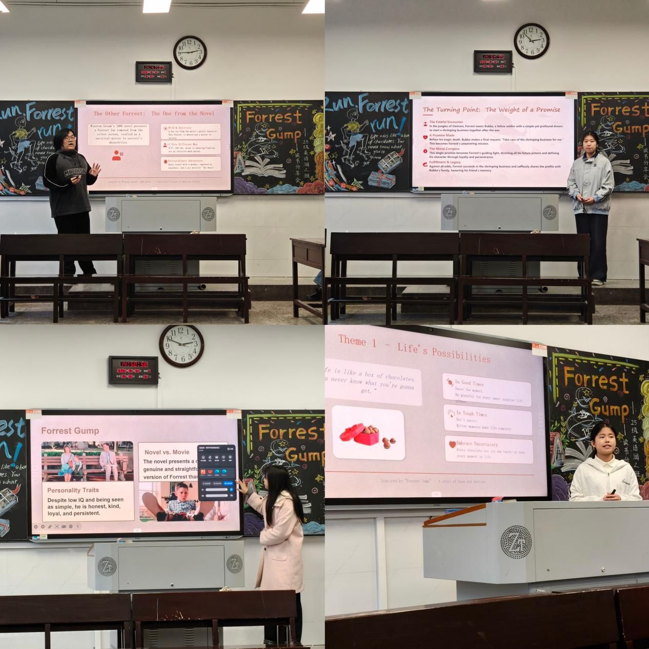 “多维视角剖析”环节,四位同学依次从背景、人物、情节、主题四个维度对《阿甘正传》进行深度英文讲解。讲解同学从作者温斯顿·格鲁姆的创作背景切入,梳理小说的时代语境,并对比原著与电影改编的差异;聚焦人物塑造,逐一剖析阿甘、母亲、布巴、丹中尉与珍妮的性格特质与成长轨迹;从情节结构入手,解读阿甘生命中那些看似偶然却暗含必然的关键时刻;围绕“生命的可能性”“专注的力量”“真正的友谊”等关键词,阐释作品给予当代读者的精神启示。同学们的讲解内容翔实、视角互补,充分展现了英文表达与文本分析的双重素养。
