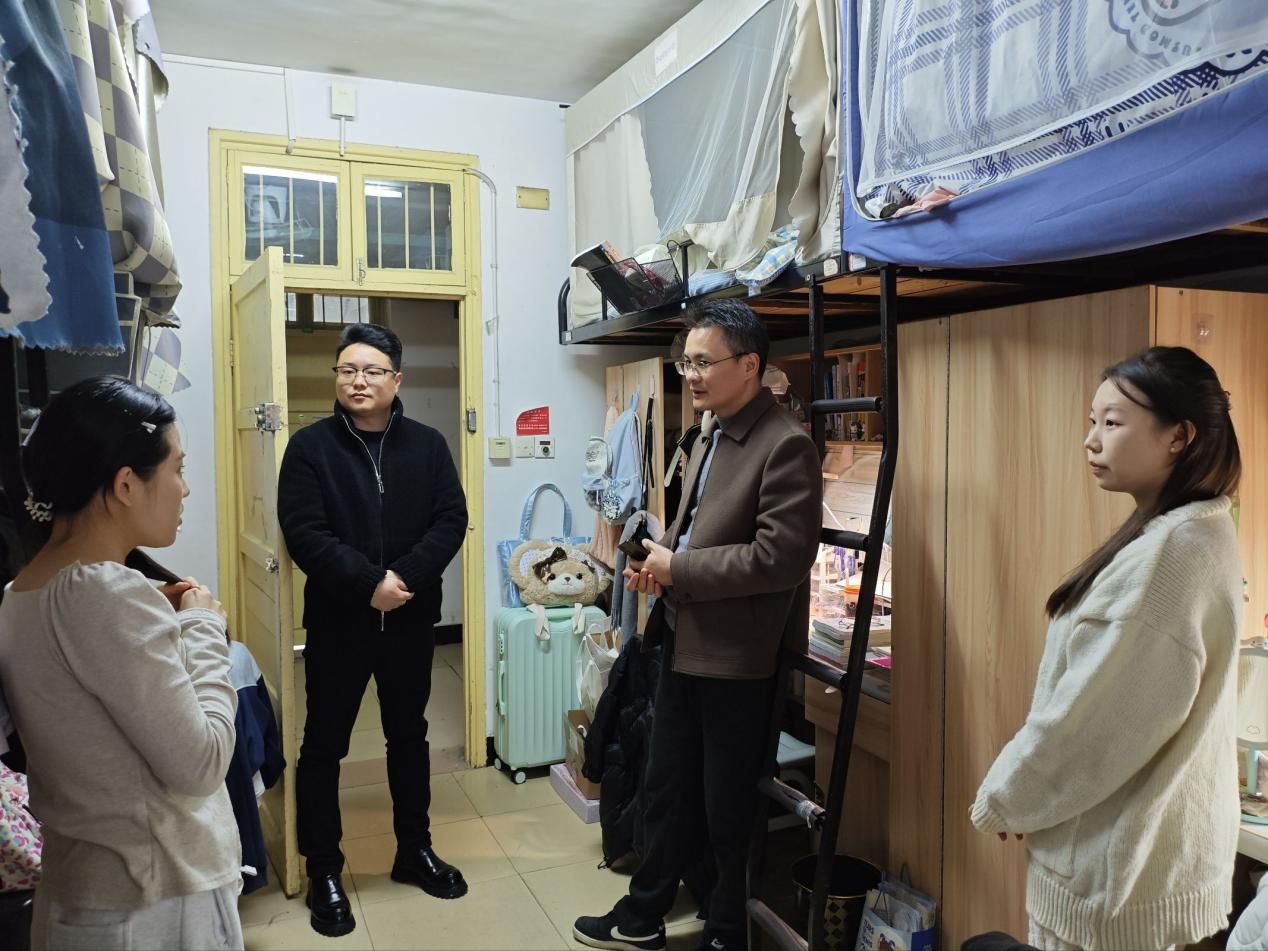 首先,戴建宇带队深入学生宿舍开展新学期寝室安全检查、内务检查,指导同学们营造安全、整洁的住宿环境,并引导同学们尽快收心归位,适应新学期的学习生活。